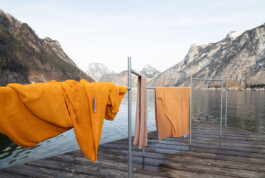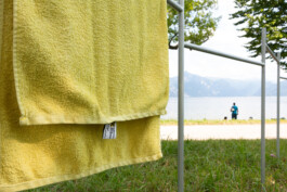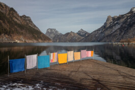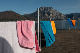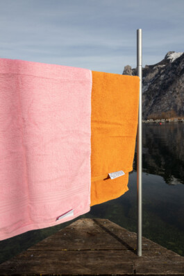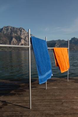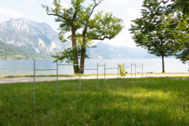 Privat, Grund, der Steg ist leer, aber Hunde sind nicht die einzigen, die hier nicht reindürfen. Nimmt man den Traunstein und das Steilufer im Osten aus, sind ca. 18% der Uferflächen des Traunsees öffentlich zugänglich, während ein mehr als doppelt so großer Anteil privat ist. Anna macht auf diesen Umstand aufmerksam, indem sie einen sieben Meter langen Handtuchhalter baut und wie einen Zaun entlang des Ufers aufstellt. Die Handtücher, die darauf hängen, entstammen Haushalten mit privatem Seezugang im östlichen Randgebiet Gmundens. Im Gehen von Haus zu Haus gesammelt, wandern diese installativ in die Öffentlichkeit. Das Handtuch als motivgebendes Objekt eines jeden Badesees und klischeebehaftetes Symbol für das Besetzen von Raum ist so Ausgangspunkt einer mehr oder weniger sozialen Plastik, die beim Saunagang von Plateau Blo (Salzkammergut 2024) zum Handtuchverleih wird und im Skulpturenpark (Parallel Vienna) fürs Wohnbausparen wirbt.