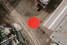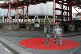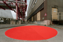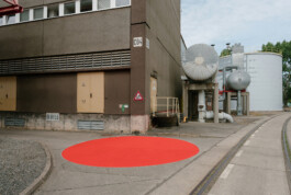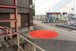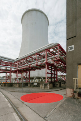 Hot Spot markiert den heißesten Punkt am Gelände des ehemaligen Heizkraftwerks Chemnitz Nord mit einem leuchtend roten Kreis. Was an eine Standortmarkierung auf einem Stadtplan erinnert, hebt die Notwendigkeit der Neuorientierung und Verbindung in brennenden Zeiten wie diesen hervor.