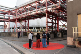 Hotspot markiert den heißesten Punkt am Gelände des ehemaligen Heizkraftwerks Chemnitz Nord mit einem leuchtend roten Kreis. Was an eine Standortmarkierung auf einem Stadtplan erinnert, hebt die Notwendigkeit der Neuorientierung und Wiederverbindung in brennenden Zeiten wie diesen hervor.