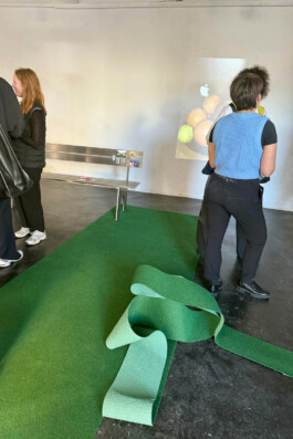 Im Sommer habe ich eine Bank aus Edelstahl gebaut. Vier Bretter für die Sitzfläche, zwei für die Rückenlehne. Die Parkbank als plastischer Inbegriff des öffentlichen Raums wird im Innenraum ausgestellt, soll aber später draußen installiert werden, damit sie auch benutzt wird. Die Sticker, die jetzt schon auf der Bank kleben, bilden vergangene, temporäre Arbeiten von mir im öffentlichen Raum ab. Als sanfter Vandalismus am eigenen Werk und Handlungsanstoß laden sie zum weiteren Bekleben der Bank ein. Öffentliches Verhalten wird provoziert, gelenkt und als Teil der künstlerischen Arbeit letztlich formalisiert.
