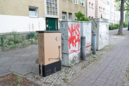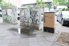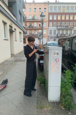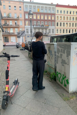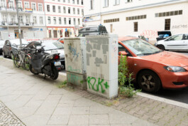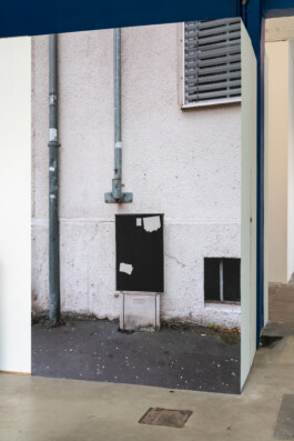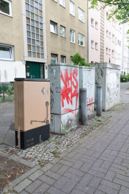 Ich reproduziere einen Berliner Kabelverteilerkasten für die Gruppenausstellung „Non Authorized Honorary“ im SPOiLER Aktionsraum, kuratiert von Johannes Klever. Eigentlich sollte der Maßstab 1:1 sein, aber aufgrund der Beschränkungen des Kartons, mit dem ich arbeite, wird mein Kasten kleiner. Ich platziere ihn neben einem lebensgroßen Fotodruck einer früheren Intervention in Linz und lasse ihn nach Ausstellungsende am Bürgersteig stehen. Während der Ausstellung invertiere ich die Arbeit noch einmal und überklebe in einer Live-Performance außerhalb des Ausstellungsraums einen Stromkasten mit grauen Rechtecken und Kreisen. Was wie eine mühsame Art der Beseitigung von Graffiti wirkt, ist letztlich selbst eine Form von Vandalismus.