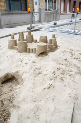 In der Werkserie Unfug eignet sich Anna den urbanen Raum spielerisch an und durchbricht dessen Ordnung. Von der Passantin wird sie selbst zur Akteurin, die städtische Utopien im Kleinen Realität werden lässt. Absperrbänder, die als Überbleibsel von Baustellen um Pfosten und Gerüste gewickelt sind, werden losgelöst und dürfen in Form eines Drachens endlich so richtig im Wind flattern. Den Sand, mit dem in Antwerpen die Pflastersteine versiegelt werden, nutzt Anna als künstlerisches Material. In Kindheitserinnerungen versunken nimmt sie sich Raum und kommentiert den von privaten und monetären Interessen getriebenen Städtebau.